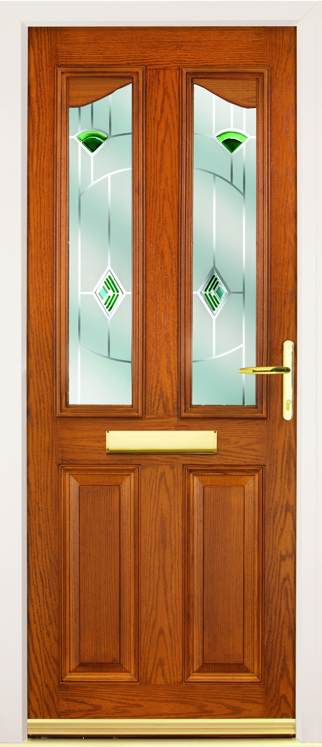 This door features Spirit glass and is finished in Golden Oak with Gold door furniture.